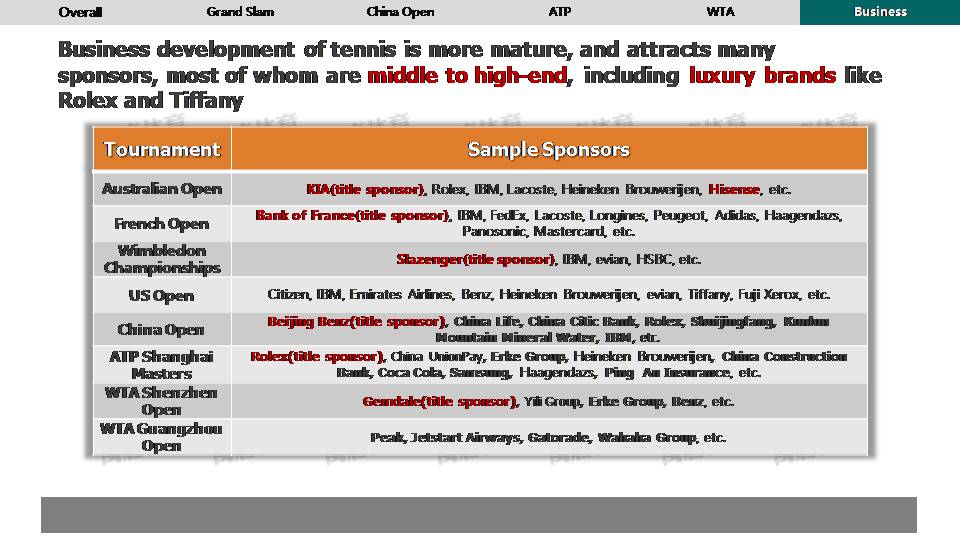 This is the final section. We make an overview of the business development of tennis in China, paying attentions to sponsorships and player endorsements.
