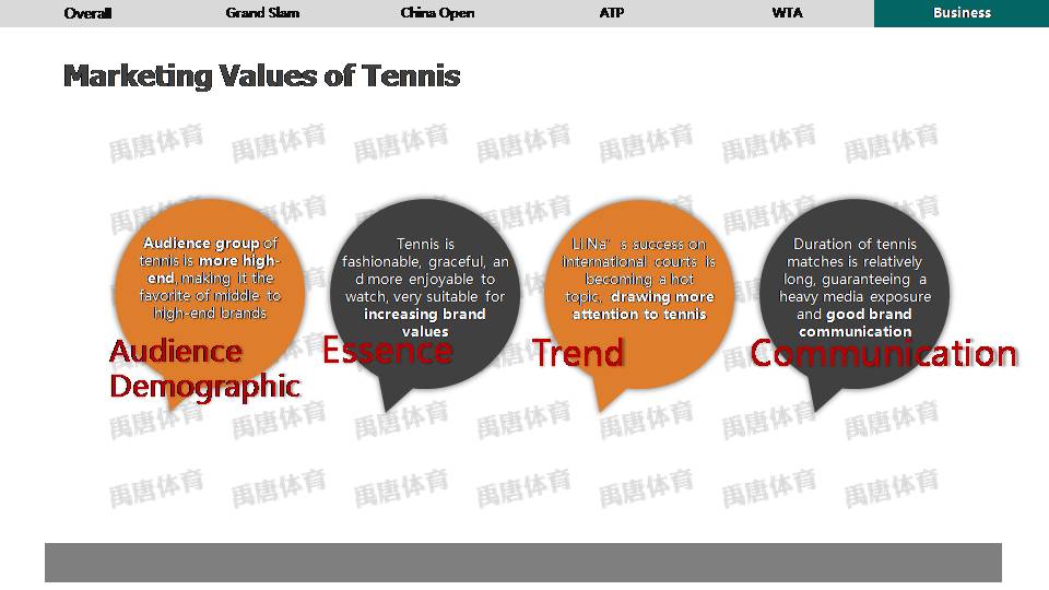 The conclusion is that the overall tennis business market in China had potentials and needed developments, and that tennis sponsorship was a valuable method for brands marketing.
