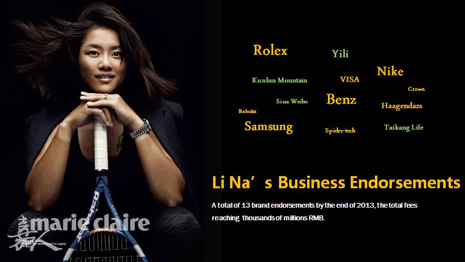We present some sponsorship cases here, including Shuijingfang, Kunlun Mountain Mineral Water, and Hisense, and take Li Na's endorsements as an example.
