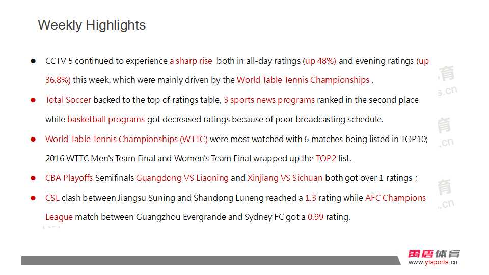 Weekly Report: WTTC were most watched with 6 matches being listed in TOP10