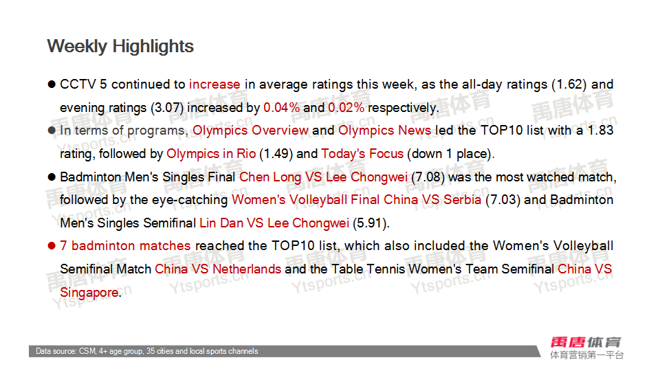 Weekly Report: Badminton Men's Singles Final Chen Long VS Lee Chongwei (7.08) was the most watched match
