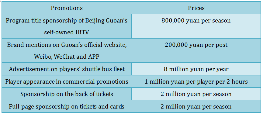 According to Guoan’s resources promotion meeting in November 2017, the club has a three-level sponsorship model, in which Official Partner, Sponsor and Supplier have to pay at least 50 million yuan, 5 million yuan and 1 million yuan respectively. At the same time, the club also released its sponsor recruiting plan regarding ad rights on player jerseys, during home games and other sponsorship opportunities.