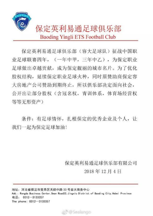 According to Chinese football media, Sike Football, China League Two side Baoding Yingli ETS Football Club made an announcement on December 4 to sell a stake in the club.
