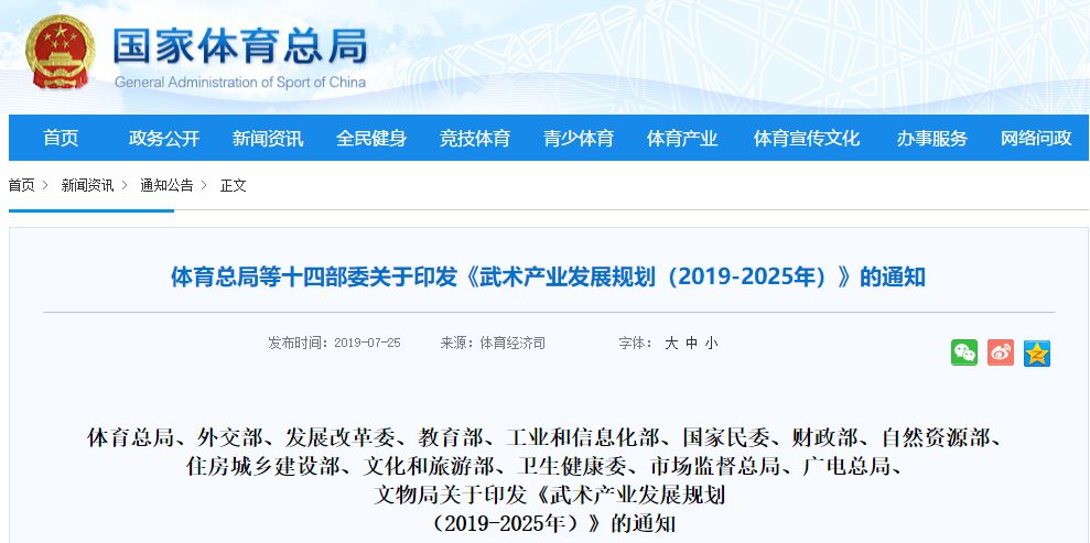Fourteen Chinese government departments have recently released a joint Development Plan for the Wushu Industry (2019-2025), aimed at helping the Wushu industry grow faster and stronger. It is unusual to see so many departments collaborating together to develop one industry.