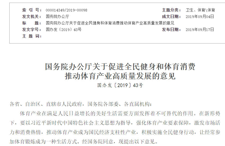 On September 17, the General Office of the State Council of China published an opinion piece aimed at promoting national fitness, increased sports consumption, and pushing the healthy growth of the sports industry in China.